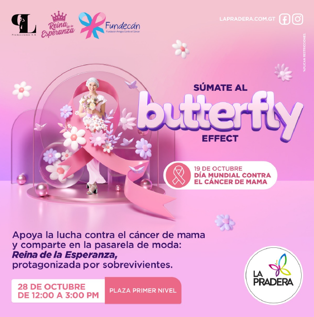 Galerías La Pradera invita a la comunidad a unirse a esta importante celebración de la vida y a mostrar su apoyo a la causa del cáncer de mama. La moda se unirá a la lucha, demostrando que cada acción, por pequeña que parezca, puede tener un impacto significativo. Acompáñenos en Butterfly Effect: Reina de la Esperanza Fundecán y contribuyamos juntos a difundir un mensaje de esperanza, solidaridad y concienciación en este Mes de la Sensibilización sobre el cáncer de mama.