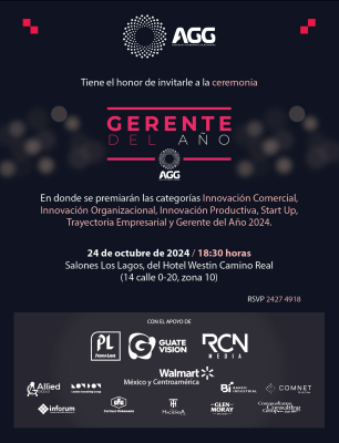 Guatemala, 15 de octubre de 2024.– Por décimo octava ocasión, la Asociación de Gerentes de Guatemala (AGG) llevará a cabo el galardón «Gerente del Año 2024«, cuyo propósito es reconocer la innovación, el desarrollo humano, la productividad y el emprendimiento empresarial y social de quienes han tenido el valor de pensar y actuar de manera diferente. Esta edición, revierte aún de mayor importancia, pues coincide con la celebración del 65 aniversario de la AGG. Este prestigioso galardón destaca a los líderes empresariales que han sobresalido por su capacidad de gestión y su valiosa contribución al desarrollo económico y social de Guatemala.