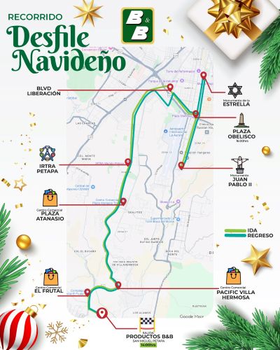 El desfile contará con 4 carrozas temáticas, luces, música y muchas sorpresas más. El recorrido iniciará en la planta de B&B en San Miguel Petapa, pasando por el parque central de San Miguel Petapa y transitará hacia Calle Real El Frutal, Avenida Petapa, Boulevard Liberación, Avenida Las Américas, Plaza el Obelisco, Avenida Reforma y Monumento Tecún Umán, regresando nuevamente por Avenida La Petapa, Calle Real El Frutal y Parque central de San Miguel Petapa.