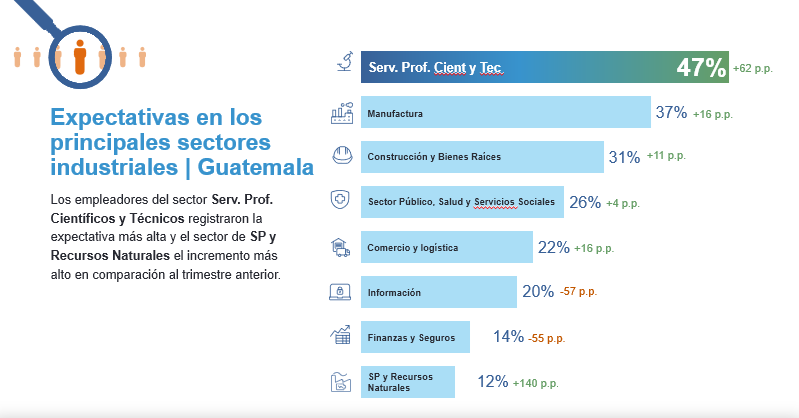 En todos los sectores se anticipan favorables expectativas de contratación para el primer trimestre de 2026. El sector más competitivo del país es Servicios Profesionales Científicos y Técnicos con una expectativa de empleo del 47%, le sigue Manufactura con 37% y Construcción y Bienes Raíces con 31%.